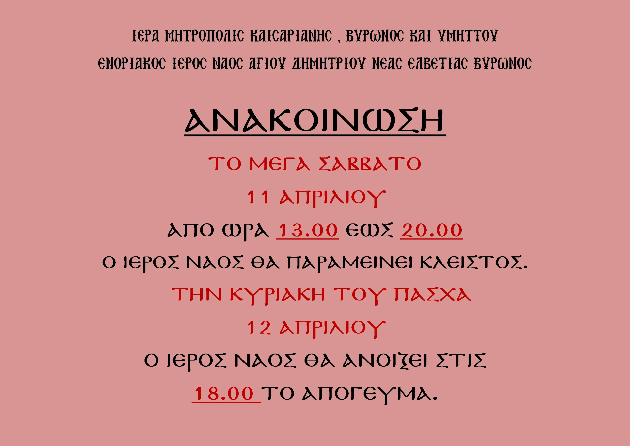 Έκτακτο Ωράριο Λειτουργίας Ιερού Ναού λόγω της Εορτής του Πάσχα. Έκτακτο Ωράριο Λειτουργίας Ιερού Ναού λόγω της Εορτής του Πάσχα.3ΑΝΑΚΟΙΝΩΣΕΙΣ11 Απριλίου, 2026Έκτακτο Ωράριο Λειτουργίας Ιερού Ναού λόγω της Εορτής του Πάσχα.3ΑΝΑΚΟΙΝΩΣΕΙΣ11 Απριλίου, 20263ΑΝΑΚΟΙΝΩΣΕΙΣ11 Απριλίου, 2026
