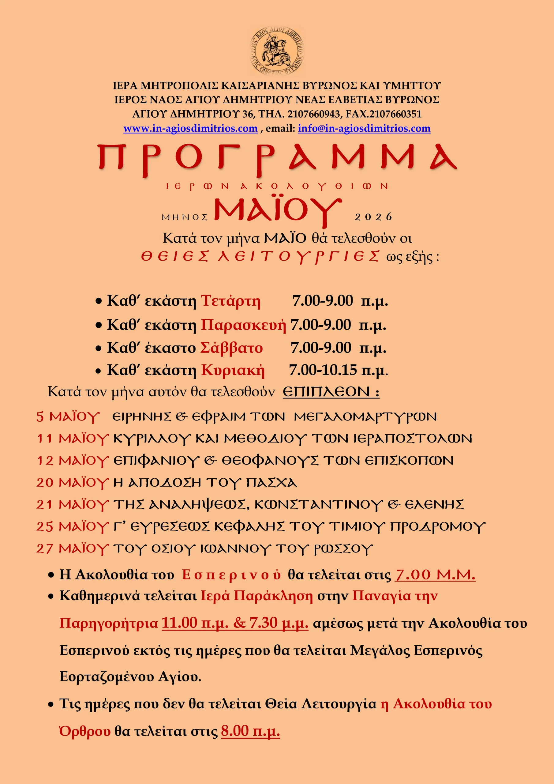 • Πρόγραμμα Ιερών Ακολουθιών Μηνός Μαΐου