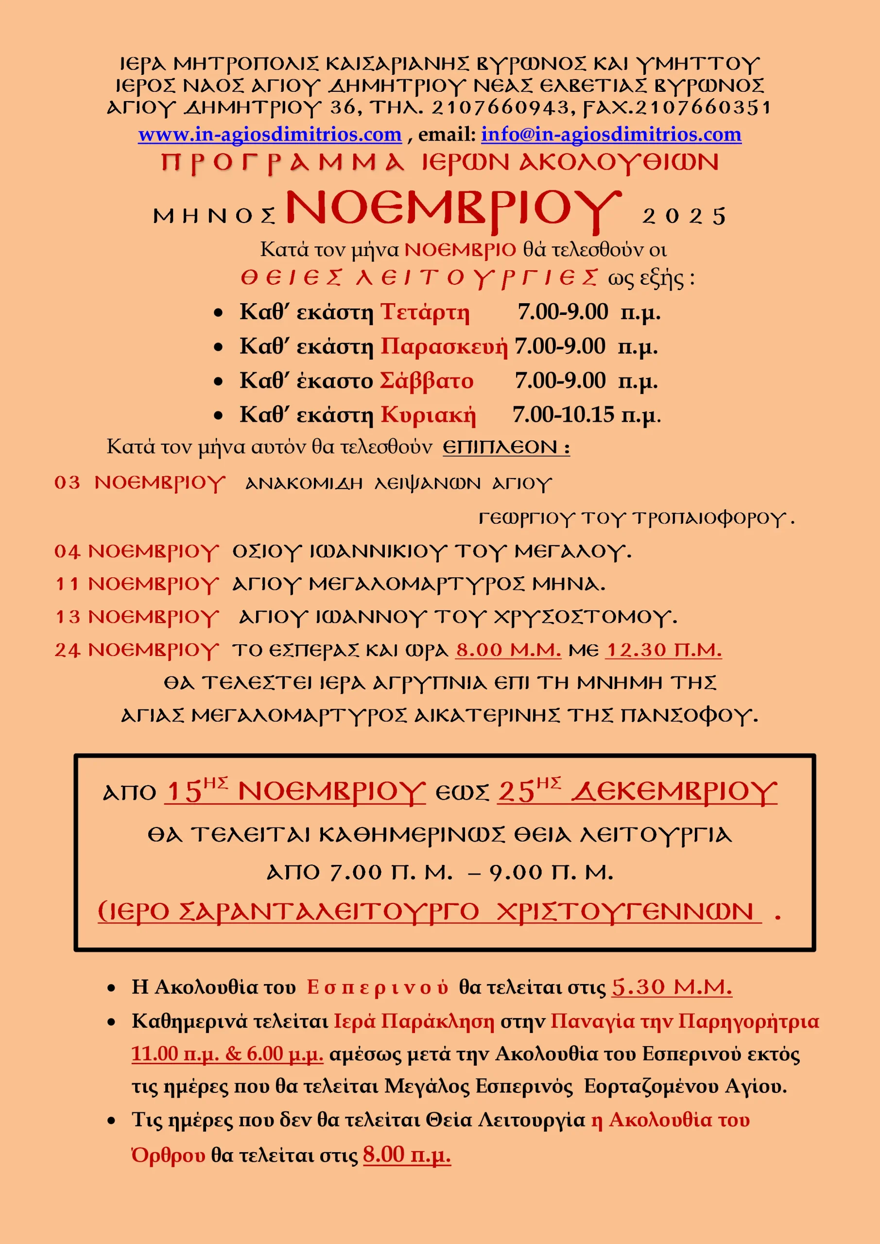 • Πρόγραμμα Ιερών Ακολουθιών Μηνός Νοεμβρίου 2025