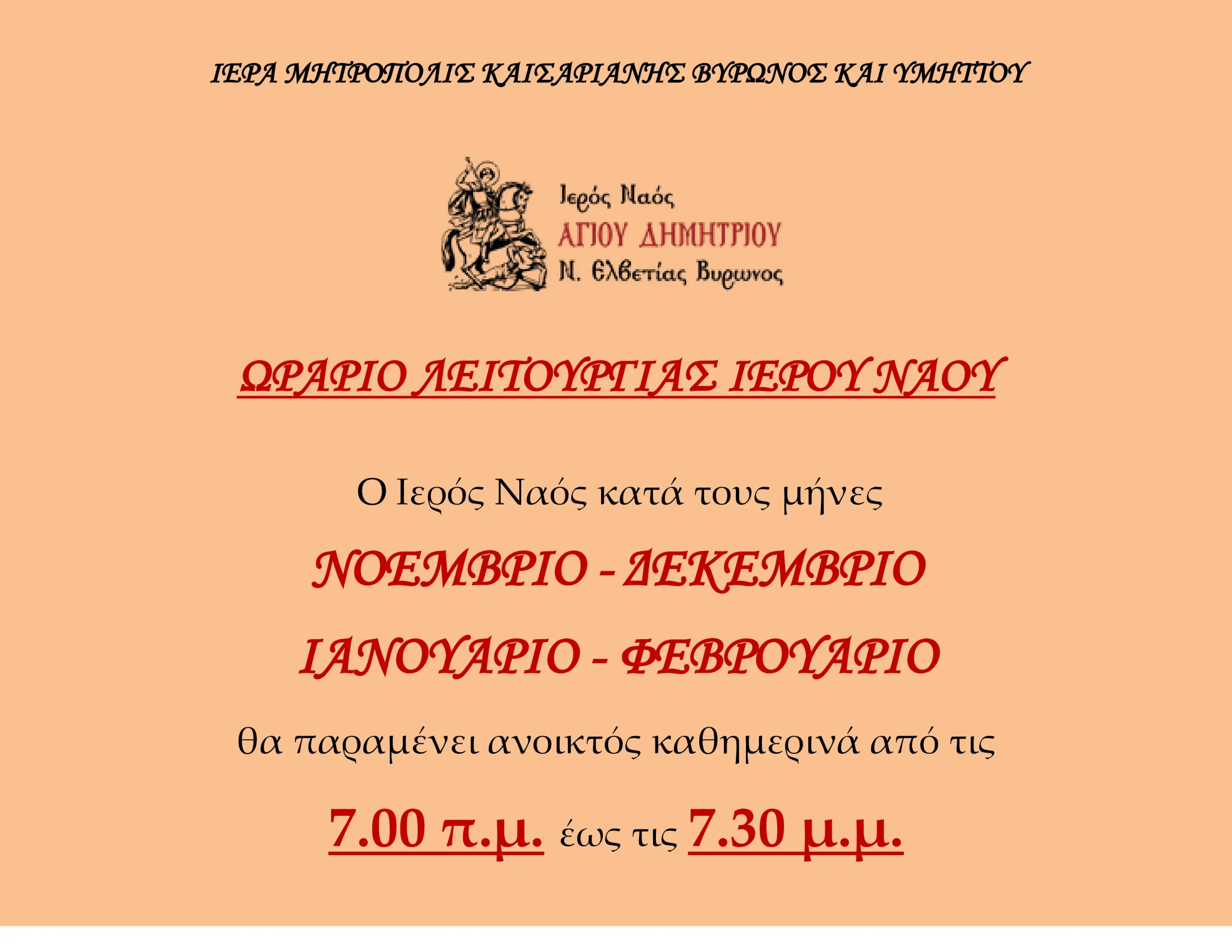 Ωράριο Λειτουργίας Ιερού Ναού Χειμερινής Περιόδου