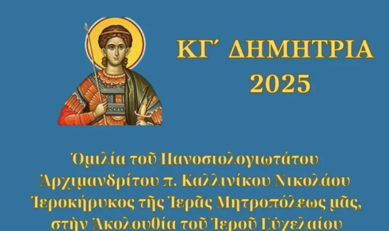 Ενοριακές ΕιδήσειςΟμιλίες25 Οκτωβρίου, 2025Διαβάστε περισσότερα..Ἡ Ὁμιλία τοῦ κ. Ἐλευθερίου Ἐλευθεριάδη πραγματοποιήθηκε στὶς 19/10/25 στὸν Ἱερό μας Ναὸ στὰ πλαίσια τῶν Ἑορταστικῶν ἐκδηλώσεων τῶν ΚΓ΄ Δημητρίων πρὸς τιμὴν τοῦ Προστάτου τῆς ἐνορίας μας.