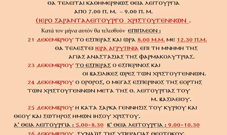 ΠΡΟΓΡΑΜΜΑ ΙΕΡΩΝ ΑΚΟΛΟΥΘΙΩΝ30 Νοεμβρίου, 2025Διαβάστε περισσότερα..Πρόγραμμα Ιερών Ακολουθιών μηνός Δεκεμβρίου