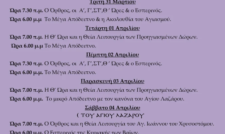 ΠΡΟΓΡΑΜΜΑ ΙΕΡΩΝ ΑΚΟΛΟΥΘΙΩΝ28 Μαρτίου, 2026Διαβάστε περισσότερα..Πρόγραμμα Ιερών Ακολουθιών ΣΤ’ Νηστειών