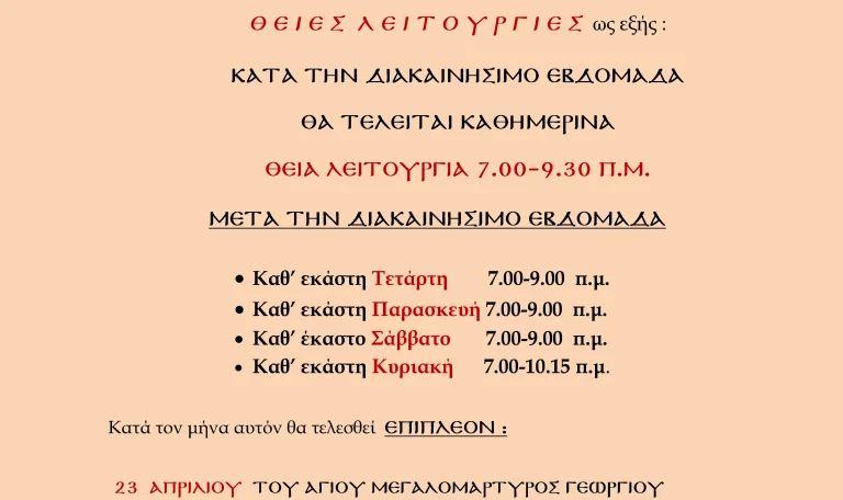 ΠΡΟΓΡΑΜΜΑ ΙΕΡΩΝ ΑΚΟΛΟΥΘΙΩΝ13 Απριλίου, 2026Διαβάστε περισσότερα..Πρόγραμμα Ιερών Ακολουθιών μηνός Απριλίου