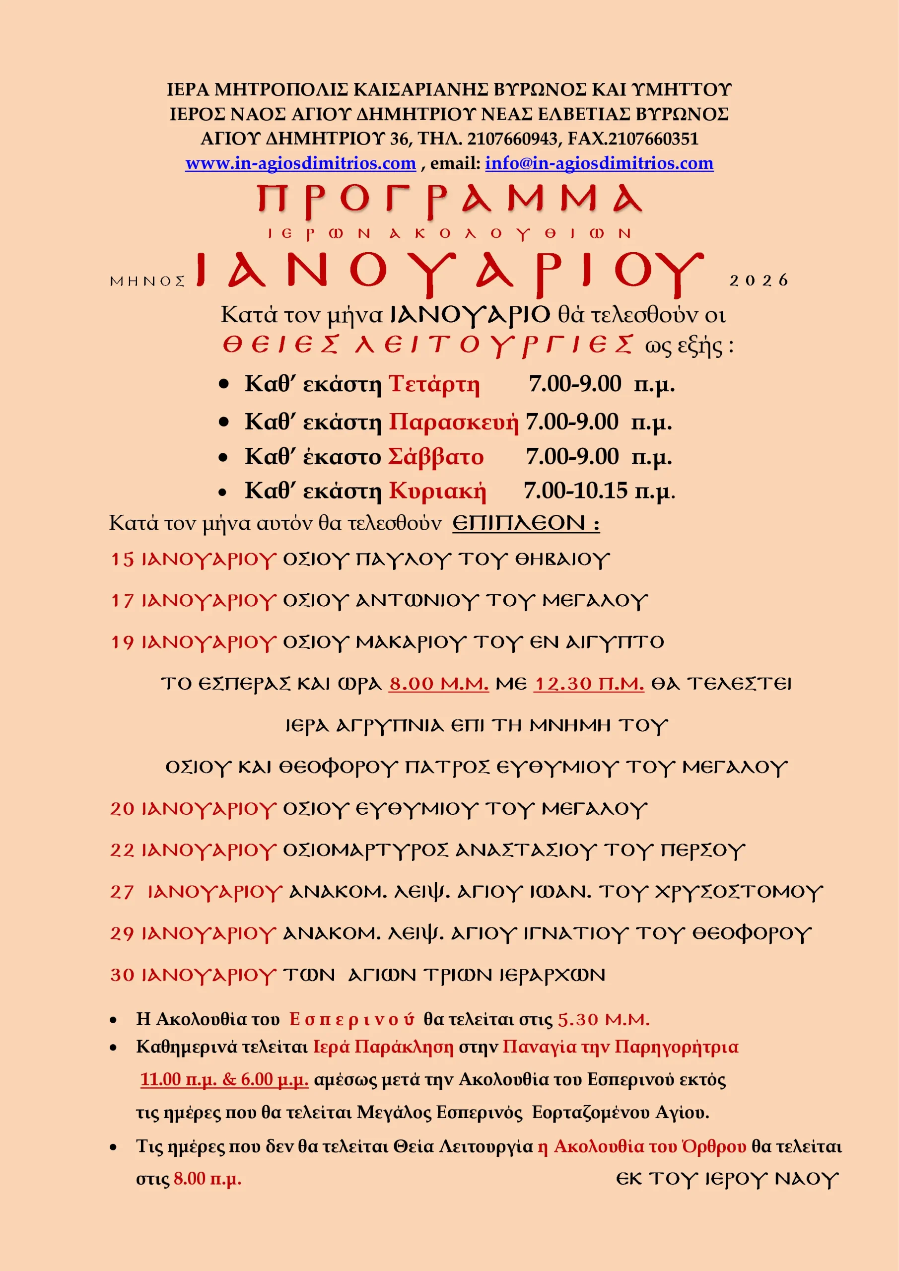 Πρόγραμμα Ιερών Ακολουθιών Μηνός Ιανουαρίου 2026