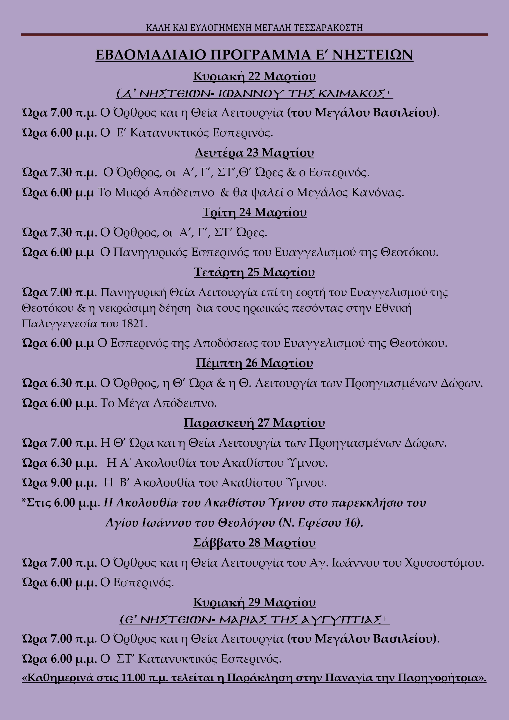 Πρόγραμμα Ιερών Ακολουθιών Εβδομάδος Ε’ Νηστειών Πρόγραμμα Ιερών Ακολουθιών Εβδομάδος Ε’ Νηστειών2ΠΡΟΓΡΑΜΜΑ ΙΕΡΩΝ ΑΚΟΛΟΥΘΙΩΝ#ΠΡΟΓΡΑΜΜΑ ΑΚΟΛΟΥΘΙΩΝ22 Μαρτίου, 2026Πρόγραμμα Ιερών Ακολουθιών Εβδομάδος Ε’ Νηστειών2ΠΡΟΓΡΑΜΜΑ ΙΕΡΩΝ ΑΚΟΛΟΥΘΙΩΝ#ΠΡΟΓΡΑΜΜΑ ΑΚΟΛΟΥΘΙΩΝ22 Μαρτίου, 20262ΠΡΟΓΡΑΜΜΑ ΙΕΡΩΝ ΑΚΟΛΟΥΘΙΩΝ#ΠΡΟΓΡΑΜΜΑ ΑΚΟΛΟΥΘΙΩΝ22 Μαρτίου, 2026